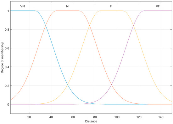 Figure 3 illustrates fuzzy membership functions depicting four linguistic variables (VN, N, F, and VF) represented across a distance domain ranging from 0 to 140 units. Each linguistic variable is characterized by a trapezoidal membership function that overlaps with adjacent functions, creating smooth transitions between categories. The leftmost function, Very Near (VN), peaks at the lower distance values, followed by Near (N), Far (F), and Very Far (VF), which progress towards higher distance values. The functions exhibit symmetrical crossover points at approximately 0.5 degrees of membership, where adjacent functions intersect, ensuring a continuous and well-distributed fuzzy classification system. The trapezoidal shapes maintain full membership (a value of 1) over certain intervals before gradually decreasing, providing stable regions of complete belonging to each linguistic category.