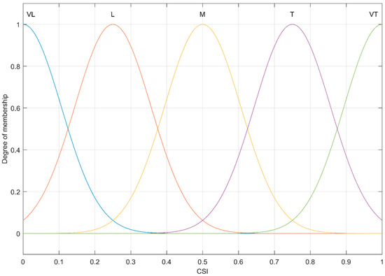 Figure 4 shows a fuzzy membership function plot depicting five linguistic variables represented by overlapping curves across a CSI range from 0 to 1. The membership functions are labeled as very loose (VL), loose (L), moderate (M), tight (T), and very tight (VT), each represented by distinct colored curves that peak at different CSI values. Each curve exhibits a triangular or trapezoidal shape with smooth transitions, where the membership value reaches a maximum of 1 at its peak and gradually decreases to 0 at its boundaries. The curves are systematically distributed across the domain with significant overlap between adjacent membership functions, ensuring continuous coverage and smooth linguistic transitions. The VL function peaks at 0, L at approximately 0.25, M at 0.5, T at 0.75, and VT at 1.0, creating a symmetrical distribution of linguistic variables across the CSI range.