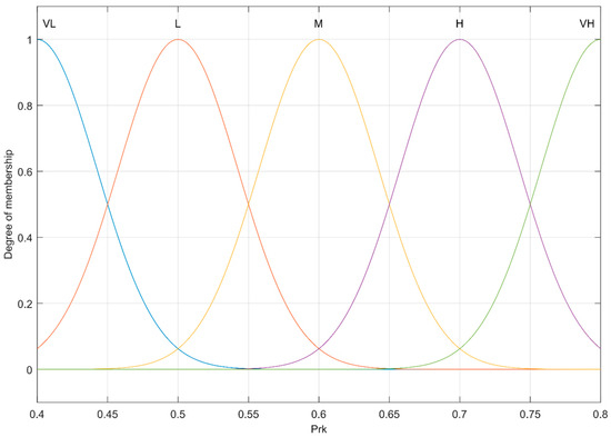 Figure 5 illustrates a fuzzy membership function plot displaying the Gaussian membership function of the domain ranging from 0.4 to 0.8. The membership functions are labeled as very low (VL), low (L), medium (M), high (H), and very high (VH), with each function reaching a maximum degree of membership of 1.0 at their respective peaks. The VL function starts at full membership at 0.4 and decreases linearly, while the VH function increases to full membership as it approaches 0.8. The intermediate functions L, M, and H are peaking at approximately 0.5, 0.6, and 0.7, respectively, with symmetric slopes on either side. Each adjacent pair of membership functions intersects at approximately 0.5 degrees of membership, ensuring smooth transitions between linguistic variables. The y-axis represents the degree of membership ranging from 0 to 1, while the x-axis shows the values, creating a comprehensive fuzzy logic control system representation.