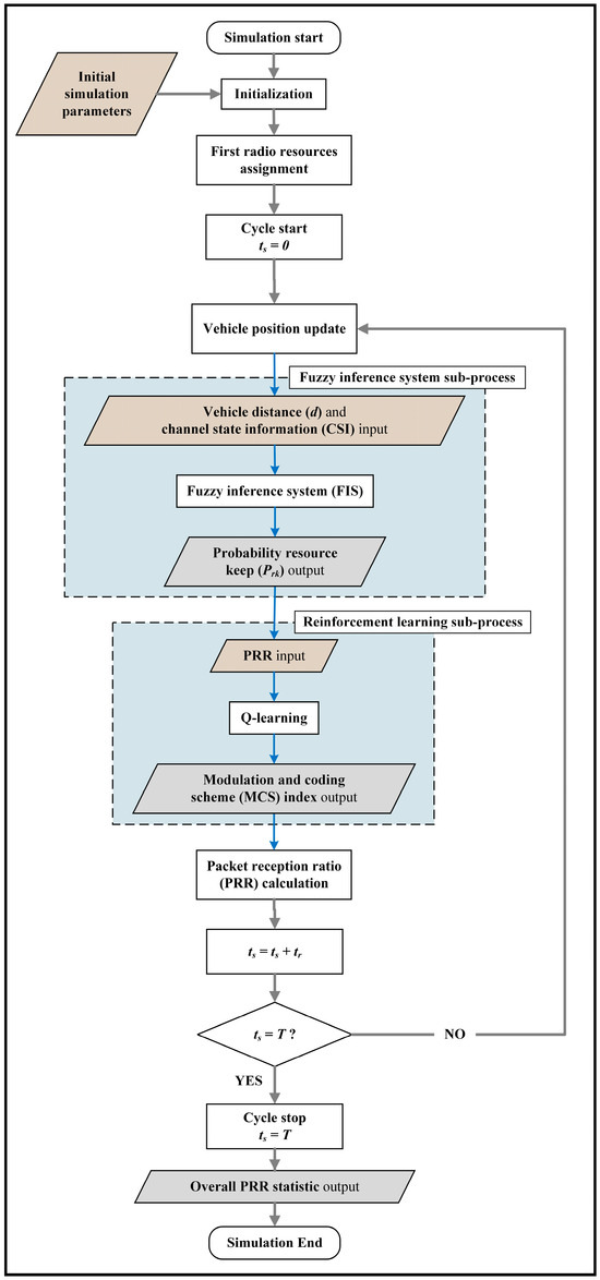 During each iteration, the system selects an action, applies the chosen MCS index to the resource management calculation, and generates the PRR statistic for the following time step. This approach facilitates dynamic adaptation of the MCS index in response to changing network conditions, potentially enhancing the overall performance of C-V2X communications. The Q-learning function itself can be expressed as