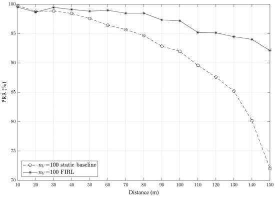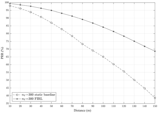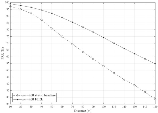Table 3 presents a comprehensive result of PRR improvement percentages for the FIRL system across three different distance scenarios: 50, 100, and 150 m. The data compares FIRL performance against a static baseline for varying values of (ranging from 100 to 400). At 50 m, FIRL demonstrates modest improvements ranging from 1.28% to 19.23%, with the baseline performance gradually declining from 97.58% to 80.89% as increases. The 100 m distance scenario shows more substantial improvements, with FIRL achieving enhancement rates from 5.67% to 67.46%, particularly notable as the baseline performance drops significantly from 91.97% to 53.1%. The most dramatic improvements are observed at 150 m, where FIRL achieves remarkable enhancement rates ranging from 27.91% to 169.83%, compensating for the severe degradation in baseline performance from 72.01% to 28.65%. The table illustrates FIRL’s increasing effectiveness at greater distances and higher values, with the most pronounced improvements occurring in challenging transmission conditions.