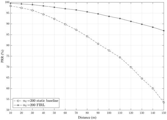 This study presents a comparative result of the PRR between two configurations across diverse scenarios, as illustrated in Figure 7, Figure 8, Figure 9 and Figure 10. The results demonstrate that the FIRL method consistently outperforms the alternative configuration in most scenarios examined. Figure 7 shows the results of low-density situations for . From Figure 7, it is observed that the PRR decreases with the increasing distance. However, an exception is observed in low-density situations, where FIRL’s effectiveness is limited. This anomaly can be attributed to the abundance of radio resources available in the network under such conditions, rendering the adaptive mechanisms employed by FIRL ineffective in improving PRR outcomes. These findings highlight the context-dependent nature of FIRL’s performance and underscore the importance of considering network density when implementing adaptive radio resource management strategies.