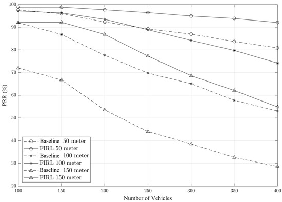 In this study, we evaluated the performance of the proposed FIRL approach compared to the baseline configuration, focusing on the impact of vehicle density on network performance. Figure 11 illustrates the PRR as a function of the total number of vehicles, ranging from 100 to 400 in increments of 50, measured at an observation vehicle distance of 50 m. The results demonstrate that PRR performance decreases as vehicle density increases, irrespective of the machine learning technique employed, primarily due to limitations in available radio resources. Notably, the FIRL approach consistently outperforms the baseline configuration, yielding improved PRR outcomes across all tested vehicle densities (). This finding suggests that, under appropriate conditions, a machine learning mechanism can achieve superior PRR performance in scenarios with higher vehicle communication demands, highlighting the potential of FIRL in enhancing vehicular network efficiency.