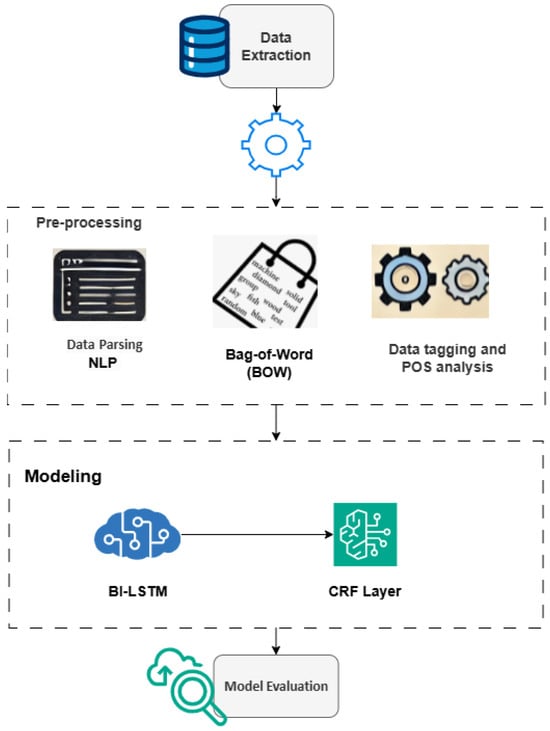 The Bi-LSTM-CRF model developed for this research integrates a Bi-LSTM network with a Conditional Random Field (CRF) layer to enhance sequential tagging tasks by capturing both contextual dependencies and transition constraints between output tags. The model’s key components are as follows: