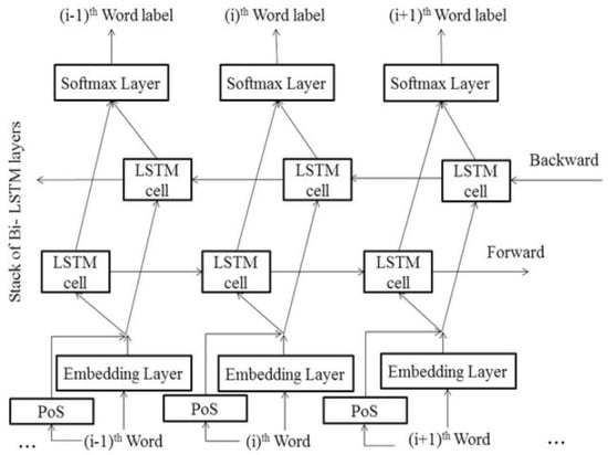 The idea behind the sequence labeling challenge is to convert an input sequence into a corresponding, identically sized output sequence. As a result, constructing a Recurrent Neural Network with a sufficient number of hidden layers has produced outstanding outcomes for sequence-to-sequence conversions. Here, recurrent connections serve as a kind of memory that allows the network’s internal state to hold on to insights from the previous inputs. The label applied to the input data is represented by the final output, which is established by taking previous inputs into account as well. There have been several versions of Recurrent Neural Nets developed, but the LSTM architecture stands out since it solves the problem of disappearing gradients effectively. Therefore, the LSTM network is frequently preferred for labeling words inside possibly long sentences. However, since the whole phrase is known ahead of time, the label assignment of a given word can be carried out more precisely if it takes into account the words that come before and after it. It is more efficient to represent these dependencies by using the Bidirectional LSTM []. To analyze data from both directions of the input sequence, the model’s network design (as illustrated in Figure 2) includes forward and backward LSTM units. The model is more capable of capturing word dependencies, regardless of where they are in the sentence, due to this bidirectional arrangement. The model is able to comprehend each word’s meaning and grammatical structure better as a result of the concatenation of the PoS vectors and the embedding layer output. As each word’s label can be predicted individually by the Bi-LSTM, the relationships between labels in the output sequence cannot be captured by the model. One word that is labeled as the beginning of an entity (B) in PoS tagging, for instance, increases the possibility that the following word will be marked as the inner (I) of the same entity. CRF comes in. To guarantee that the predicted labels adhere to correct sequential patterns, the CRF layer is layered on top of the Bi-LSTM. The possibility of label transitions (e.g., from B to I, or from I to O) is taken into consideration to effectively model the relations between the expected labels.