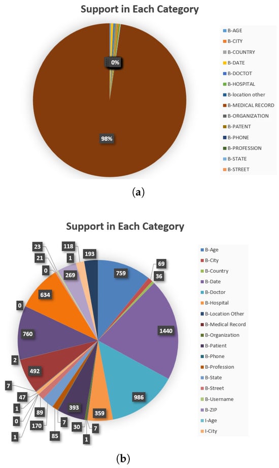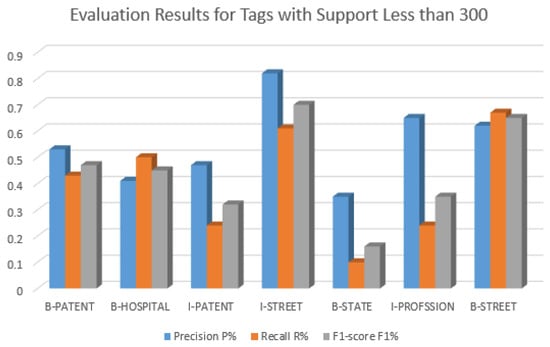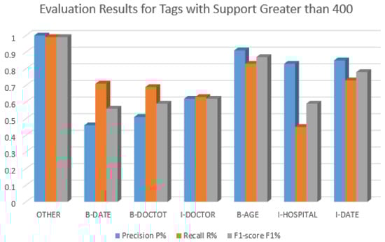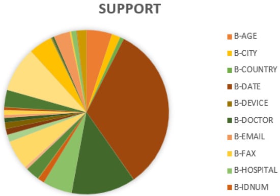 The evaluation results for all 23 core categories of PHI as defined by the HIAA using the Bi-LSTM-CRF model are presented in Table 9. When analyzing the results in the table and by looking into support values, we can see the difference between support in each category as presented in Figure 6, where the other “O” tags represent 98% of the instances, which will affect the evaluation results as shown in Figure 7.