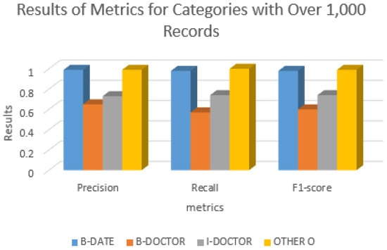 According to Table 6 and Figure 3, we can note that the numbers of OTHER “O” category represents 95% of all records with 4980 records, and it is achieved the best classifier results with precision and an F1-score of 99%, as well as the other categories with a high number of support records such as B-DATE with 4980 records, B-DOCTOR with 1912, and I-DOCTOR with 1350. All of these categories achieve good metrics results as presented in Figure 4.