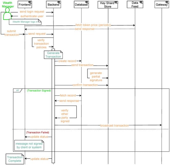 The backend confirms that the transaction has been signed and sends a transaction authorisation message to the client. If the client or system generates a second partial signature, the signatures are aggregated to form the final valid signature. The transaction is successful if either the client or the system signs the transaction request message. However, an unsigned transaction message or a declined request from the client or system results in transaction failure. Following approval, the backend broadcasts the transaction to the blockchain via the “gateway” component, as shown in Figure 2. The wealth manager user is then updated on the transaction status.