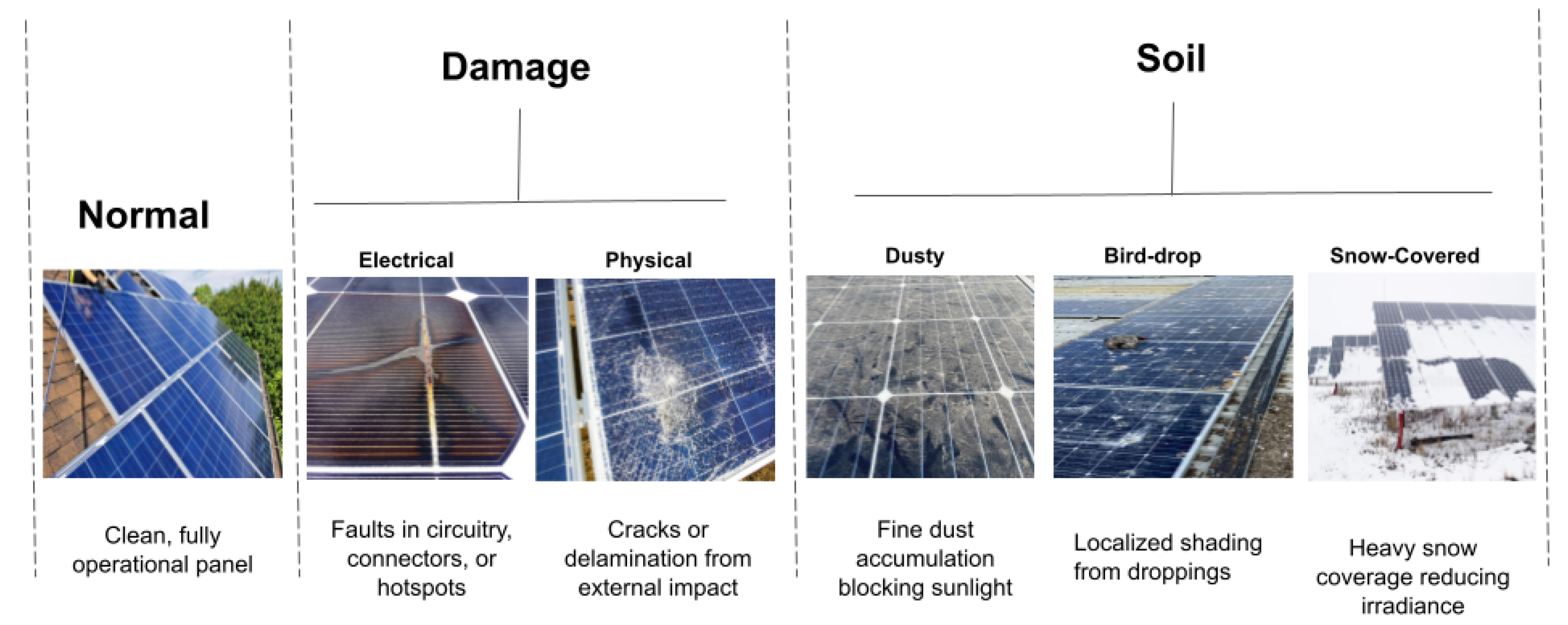 Figure 2 shows representative examples of clean panels, soiling types, and damage modalities.