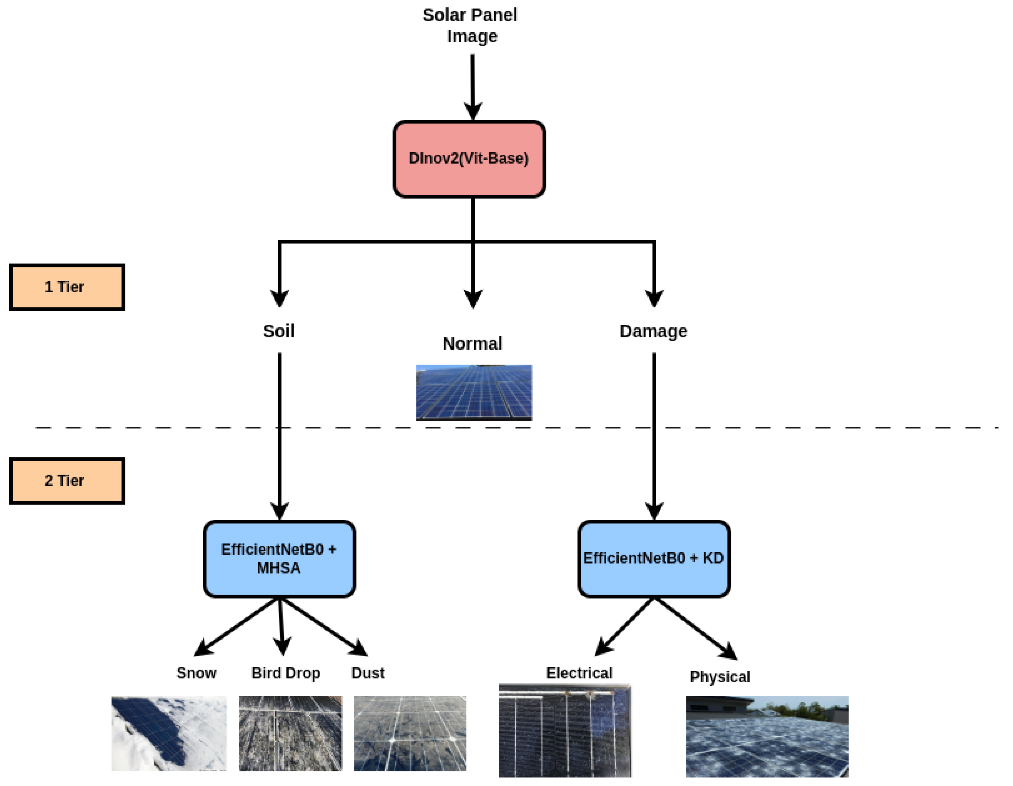 We introduce a novel two-tiered classification framework for monitoring the condition of solar panels, where Tier 1 provides high-level categorization (Normal, Soiled Damaged) using DINOv2 ViT-Base, and Tier 2 performs fine-grained classification with lightweight EfficientNet-based models.