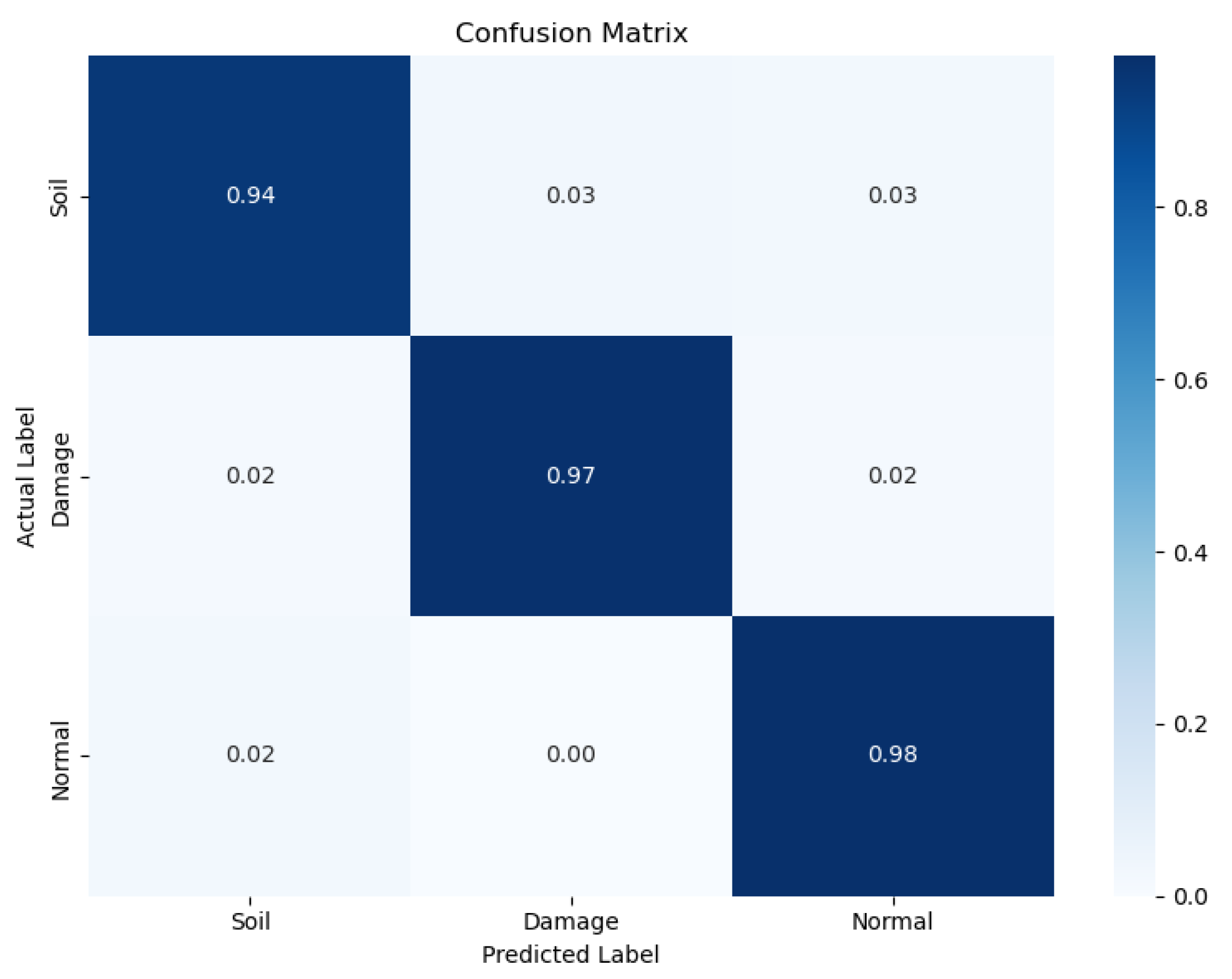 Figure 7 offers further insight into the model’s per-class prediction performance. The model demonstrates a high true-positive rate across all three classes, with minimal misclassification. In particular, the high recall (96.2%) reflects the model’s effectiveness in correctly identifying defective and soiled panels, a critical requirement for minimizing false negatives in maintenance systems for solar panels.