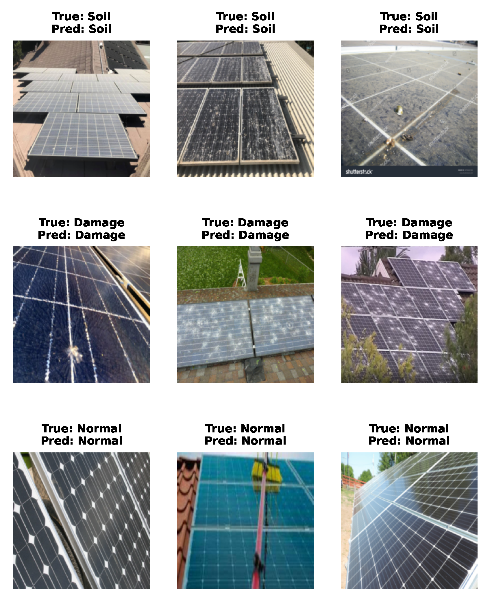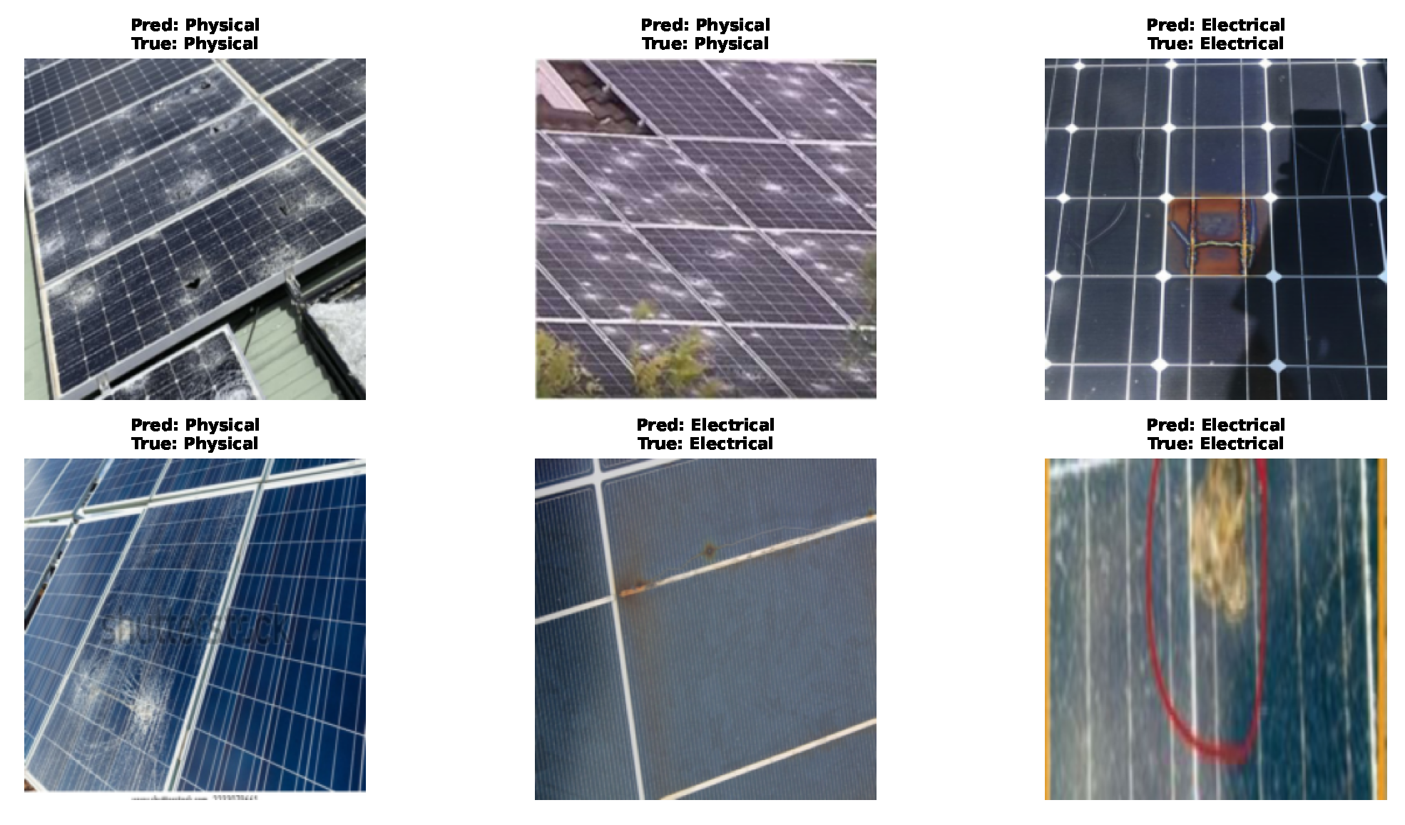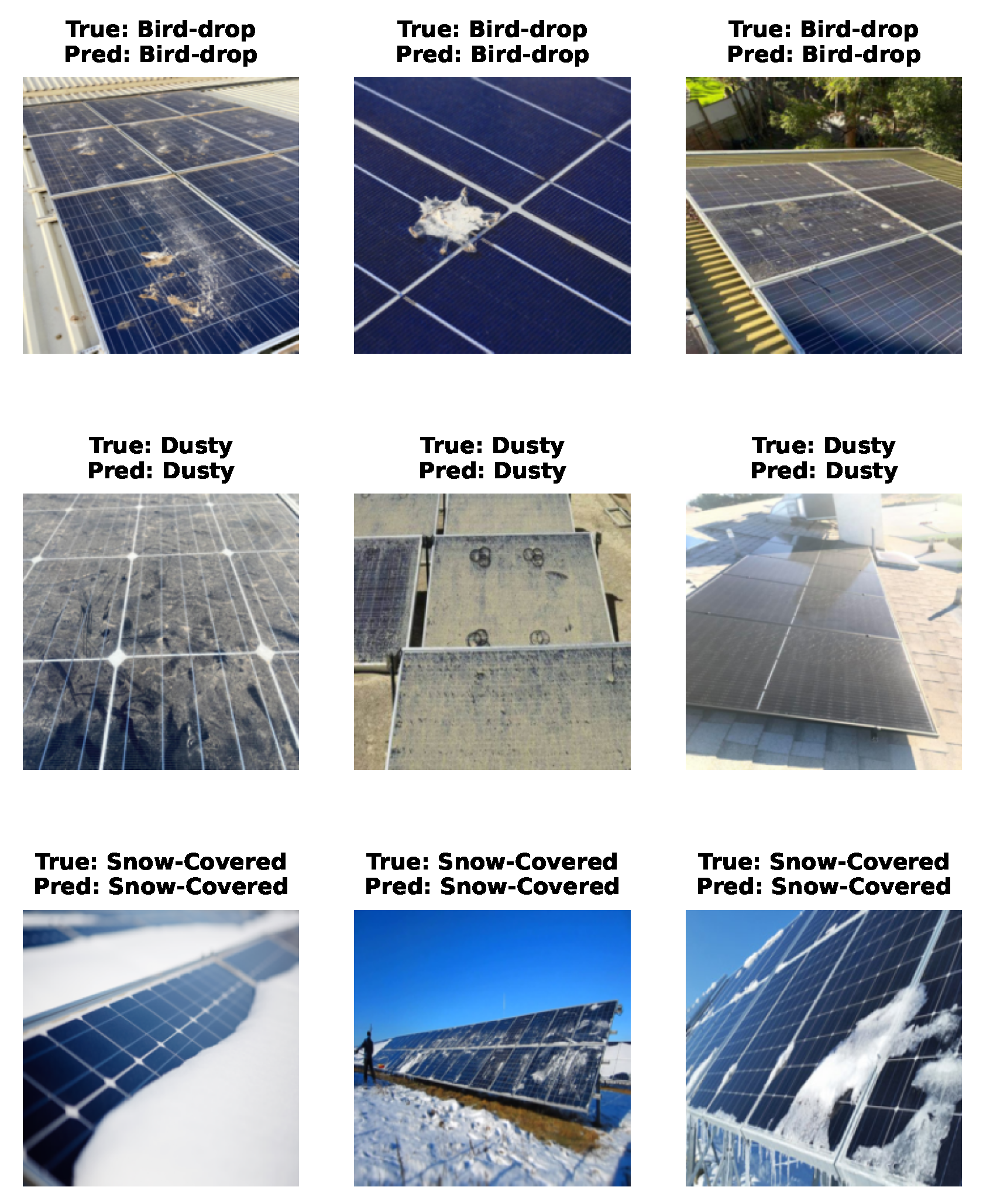 Figure 8, showcasing example predictions across diverse panel conditions. These examples highlight the model’s robustness under varied lighting, soiling patterns, and damage manifestations.