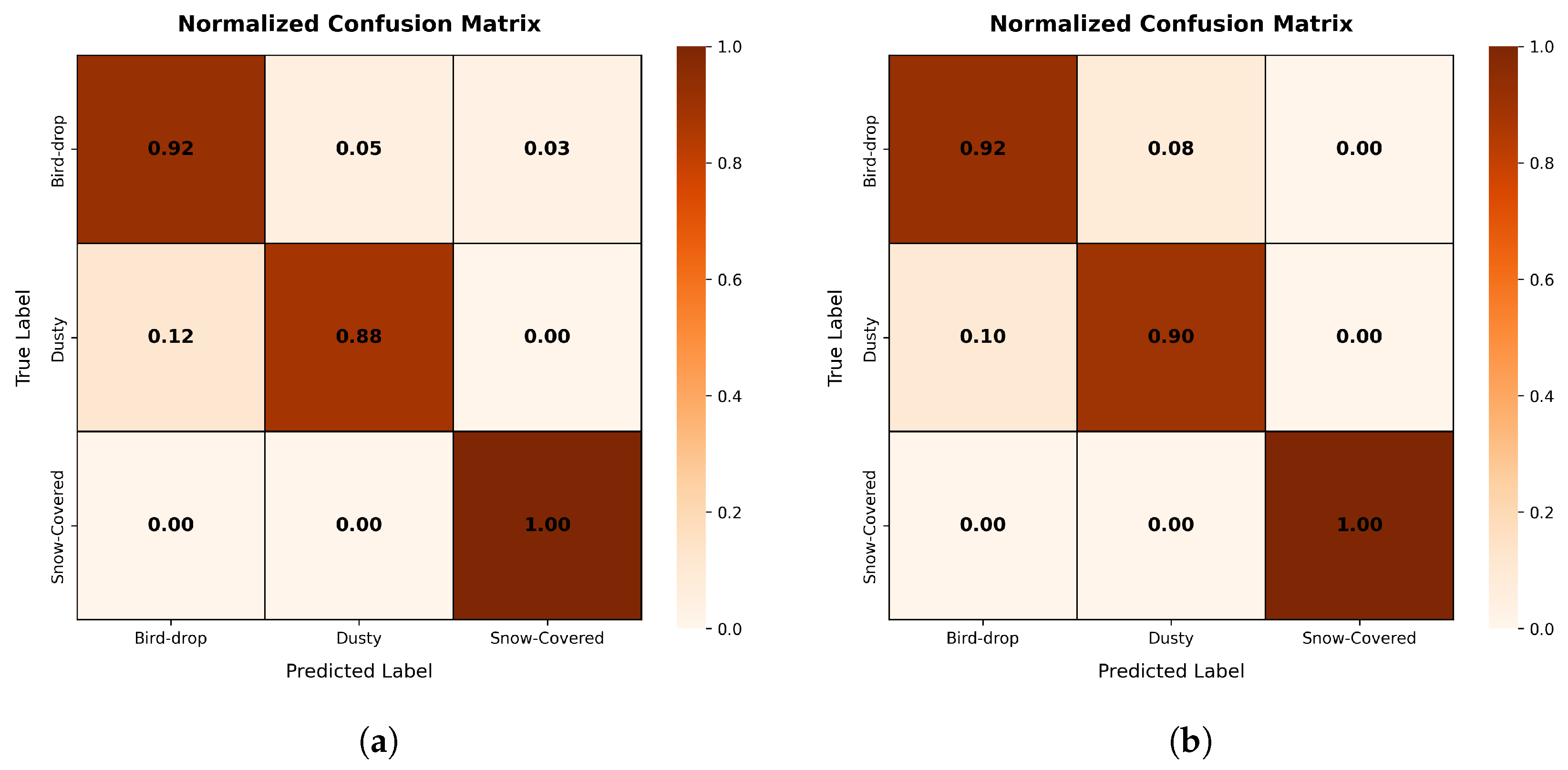 Furthermore, the proposed models maintain low parameter counts and fast inference times, making them well-suited for deployment in edge-based photovoltaic monitoring systems. The confusion matrix analysis confirmed the models’ ability to generalize well across visually similar defect types; they show a reduced tendency towards the common misclassification trends observed in baseline models.