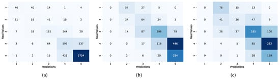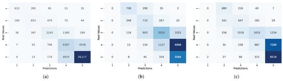 As shown in Figure 2a, the MarIA model performed strongly across sentiment classes, reaffirming its adaptability to the classification task. Class 1 (very negative sentiment) was correctly predicted in most cases, although there was some confusion with class 2 (negative sentiment) and class 3 (neutral), indicating an ongoing difficulty in distinguishing closely related negative and neutral sentiments. Class 2 achieved solid accuracy, but showed substantial confusion with class 3, and to a lesser extent with classes 1 and 4. This indicates persistent ambiguity in capturing mildly negative sentiment. Class 3 was generally recognized, although frequent misclassifications into class 4 (positive sentiment) highlighted the difficulty of clearly distinguishing neutral from slightly positive sentiment. Class 4 was robustly classified; however, confusion with class 5 (highly positive sentiment) indicated difficulty in distinguishing between fine-grained positive classes. Class 5 was identified with high accuracy and minimal confusion, demonstrating the model’s effectiveness in recognizing strong positive sentiment.