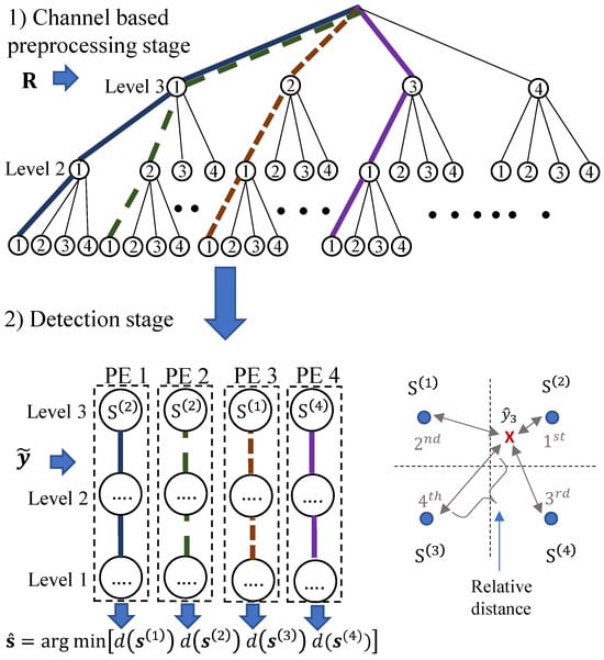 The upper part of Figure 1 illustrates an example tree diagram consisting of the most promising tree paths (MPP)s based on relative distances as identified by the NL-COMM PHY framework. We assume that four parallel processing units (PU)s are available for parallel detection, and 4-QAM-modulated symbols are transmitted. Then, the channel-based (e.g., matrix) preprocessing stage of NL-COMM PHY processing identifies four relative distance vectors that minimize the probabilistic likelihood metric of Equation (20). For this, the low complexity preprocessing introduced in Ref. [24] and Ref. [51] can be employed. Let us assume that the identified four relative distance vectors are , and . To further elaborate, the second most promising tree path is , which represents the first closest symbol to the received signal in the first level, the second closest symbol to the received signal in the second level and the first closest symbol to the received signal in the third level of the search tree.