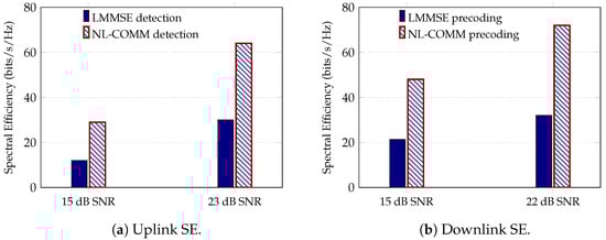 In this section, we discuss the spectral efficiency gains of NL-COMM PHY processing in the uplink and the downlink as introduced in Section 3.1.1, Section 3.2 and Section 4.2. As shown in Figure 2, NL-COMM can significantly improve the spectral efficiency in both the uplink and the downlink. In particular, NL-COMM, while using 16 MPPs, can provide throughput gains of more than 200% in existing systems, employing linear MMSE (LMMSE) processing.