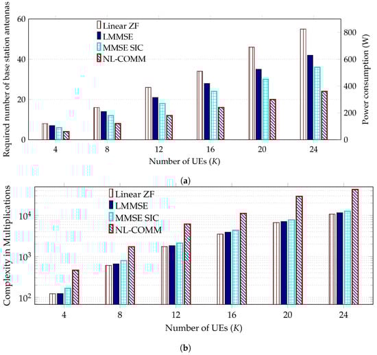 In particular, in Figure 3a, we compare the number of base station antennas and the associated power consumption required to support high-rate (64-QAM, 2/3 code rate) users at a Packet Error Rate (PER) of of various schemes, in a 3GPP CDL-B channel [54] and at a 25 dB SNR. As shown in Figure 3a, NL-COMM processing can support the same number of high-rate users with and fewer antennas than LMMSE and MMSE SIC detection, respectively. At the same time, a reduction is expected compared to ZF detection. As shown in Figure 3b, the complexity of NL-COMM is only around that of linear processing.