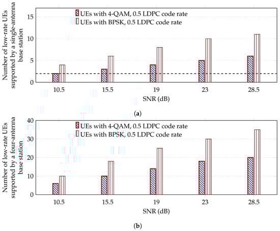 NL-COMM processing enables the allocation of available spectral efficiency to multiple users, even when the number of users exceeds the number of base station antennas, based on channel capabilities. As illustrated in Figure 4a, NL-COMM can support more than four UEs using 4-QAM modulation and 0.5 rate LDPC codes with a single-antenna base station in the uplink. The maximum number of UEs supported by existing NOMA schemes for a single-antenna base station is indicated by the dashed line in Figure 4a. Additionally, the number of UEs that can be supported by NL-COMM processing can be further increased when their rate requirements are lower (for example, using BPSK modulation) and as the number of base station antennas increases, as shown in Figure 4b.