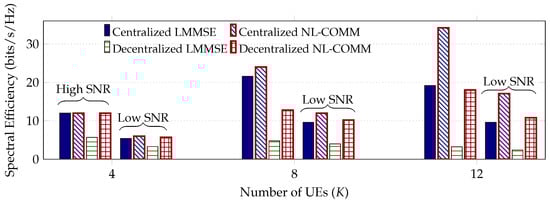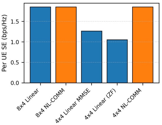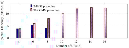 Similar to the uplink, NL-COMM can support a large number of UEs beyond the number of base station antennas in the downlink. As shown in Figure 5, NL-COMM precoding can support 2× the number of UEs than the base station antennas.