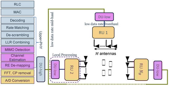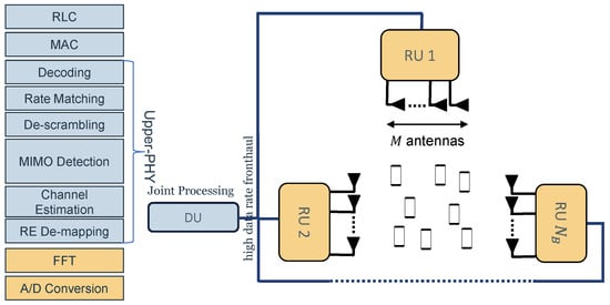 Figure 6 illustrates a centralized processing architecture for a distributed MIMO system with Radio Units (RU)s, each with M antennas. Here, we have assumed the 3GPP split 7.2× architecture, where part of the physical layer processing, referred to as lower-PHY, consisting of Fast Fourier Transform (FFT) and Analogue-to-Digital Conversion (ADC), is performed at the RU, and upper-PHY, consisting of the rest of the physical layer operations, is performed at the DU. Here, we have assumed less capable category A RUs, which cannot perform MIMO precoding as category B RUs. Note that split 7.2 minimizes the fronthaul bandwidth while also making RU less complex. For example, assuming eight-bit accuracy for I and Q signals and 100 MHz bandwidth, each RU with four antennas should send raw information at a rate of 6.4 Gbps through the fronthaul. Performing the FFT at the RU side, as in split 7.2 and data compression techniques, can reduce this rate requirement significantly. Fronthaul can be based on enhanced Common Public Radio Interface (eCPRI) [56], which can provide aggregate data rates of up to 100 Gbps. We note that the fronthaul data rate depends on the number of antennas at the RU side. For example, the above raw data rate would become 126 Gbps if each RU was equipped with 64 antennas. At the DU, centralized MIMO detection is performed, which processes all the received observables from antennas. Centralized processing can exploit the maximum spatial multiplexing gain (i.e., ) of the distributed MIMO channel.
