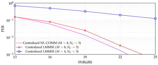 Similarly to the uplink, the likelihood metric for the downlink can be expressed based on as , where [52]. The equivalent transmitted signal point for level i, denoted as , can be expressed as , where . Then, the procedure illustrated in Figure 1, as described for the uplink, can be employed to identify the perturbation vector that approximates Equation (16).