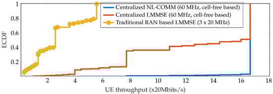 Figure 17 shows indicative OTA results obtained with the described setup from the location shown in Figure 16. As shown, NL-COMM can support the same average per-user spectral efficiency as linear approaches with half the requirement of base-station antennas. The results align with our simulation results presented in Section 5, confirming the framework’s deployability and practical benefits.