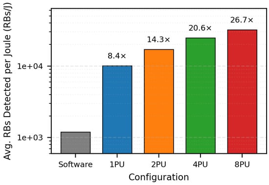 The Computational Energy efficiency gains of the NL-COMM FPGA accelerator, expressed in detected RBs per joule, including gains over the software-based NL-COMM implementation.