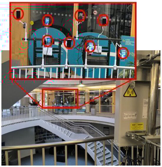 The system setup, illustrated in Figure 16, consists of a 5G base station co-located with an 8-element commercial antenna array and implemented on a DELL R740 server. The radio frontend is realized using an Ettus USRP X440 software-defined radio (Austin, TX, USA). The base station connects to a full 5G Core Network, hosted on a separate DELL R740 server, ensuring end-to-end SA operation. UE nodes include multiple commercial 5G smartphones (e.g., Nokia XR20, Espoo, Finland), providing realistic uplink and downlink traffic profiles.