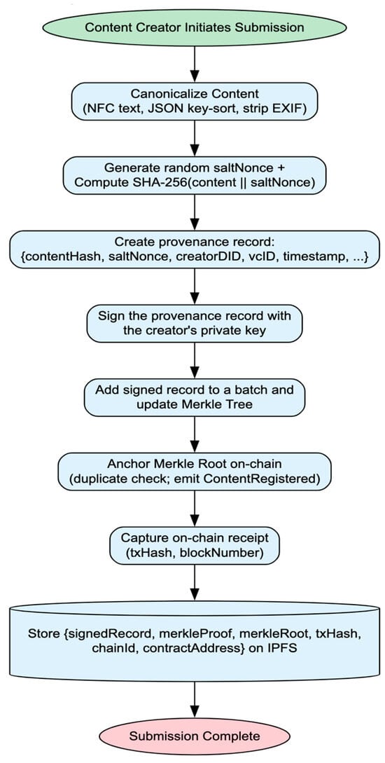 - Initial Content Registration: When a piece of content is first created or uploaded to the platform, its cryptographic hash, along with the creator’s DID and a timestamp, is immutably recorded on the blockchain [60]. This marks the genesis point of the content, establishing its verifiable origin.