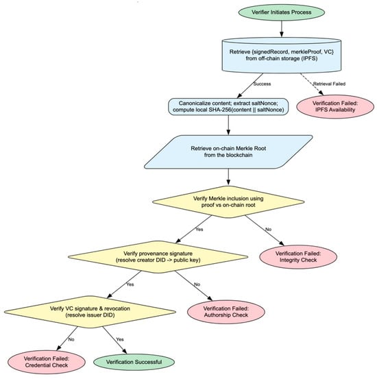 To ensure interoperability, the entire framework aligns with established standards from W3C for DIDs and VCs [34]. To address the scalability challenges associated with storing large volumes of data directly on a blockchain, VeriTrust adopts an on-chain/off-chain storage model. Only essential metadata, such as cryptographic hashes of content, DIDs, and timestamps, are immutably recorded on a public or permissioned blockchain. The actual content (articles, images, videos) is stored off-chain on decentralized storage solutions like IPFS or Web3.Storage. This approach balances the need for immutable verification records with practical scalability requirements.