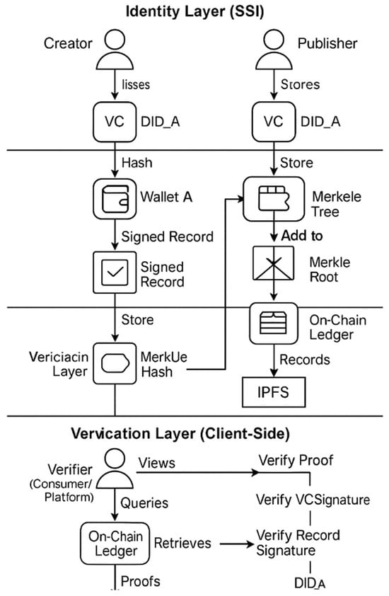 SSI architectures are grounded in cryptographic trust models that ensure non-repudiation and selective disclosure. Recent work has emphasized the importance of anchoring identity on decentralized networks to enhance privacy, eliminate intermediary reliance, and enable cross-domain authentication [29,30]. However, most studies focus on identity control and privacy preservation without establishing direct links between user identity and content authorship.