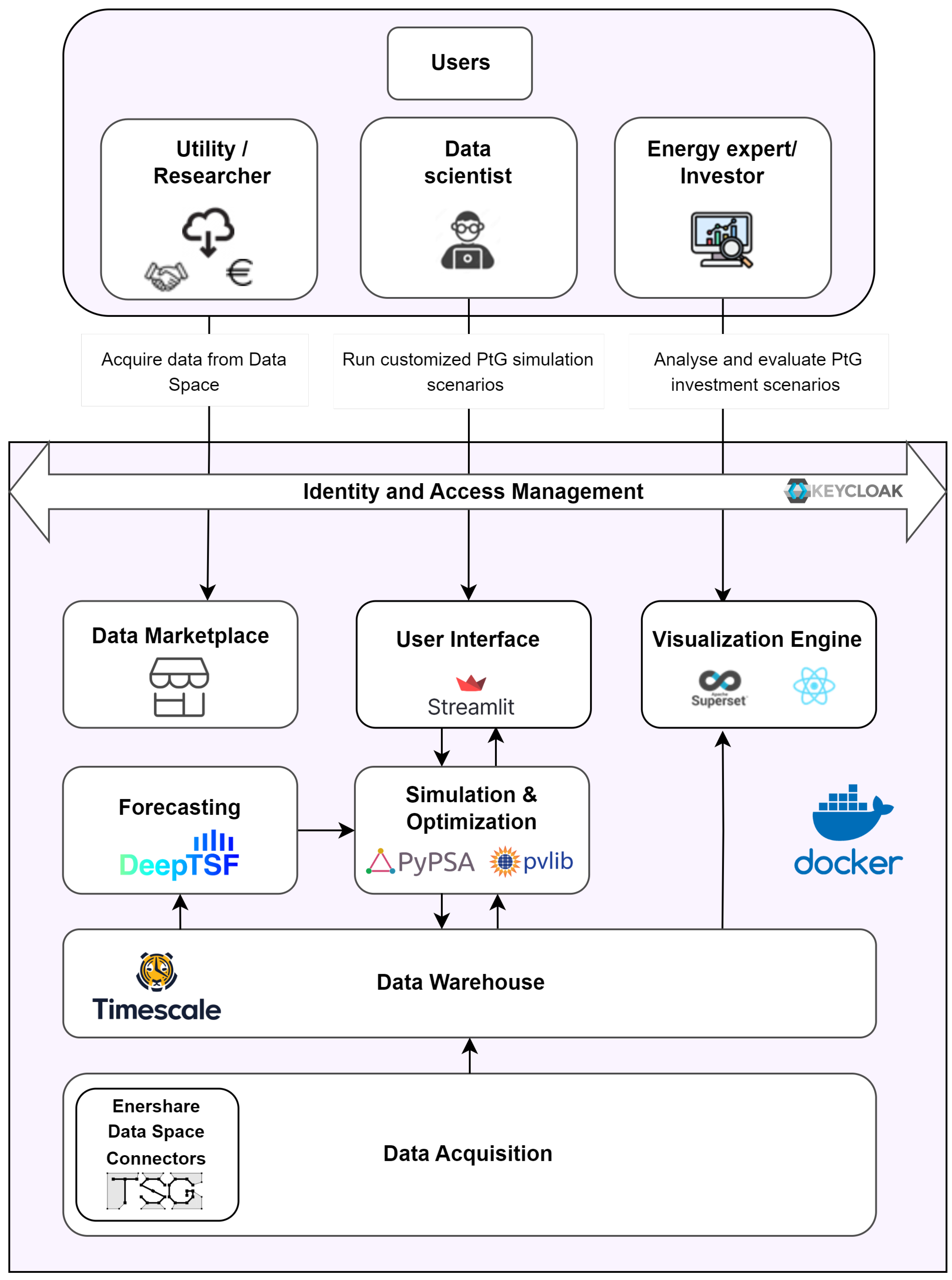 Figure 1 consists of various subcomponents of state-of-the-art technology, serving multiple user roles, namely, researchers, data scientists, energy experts, and investors.