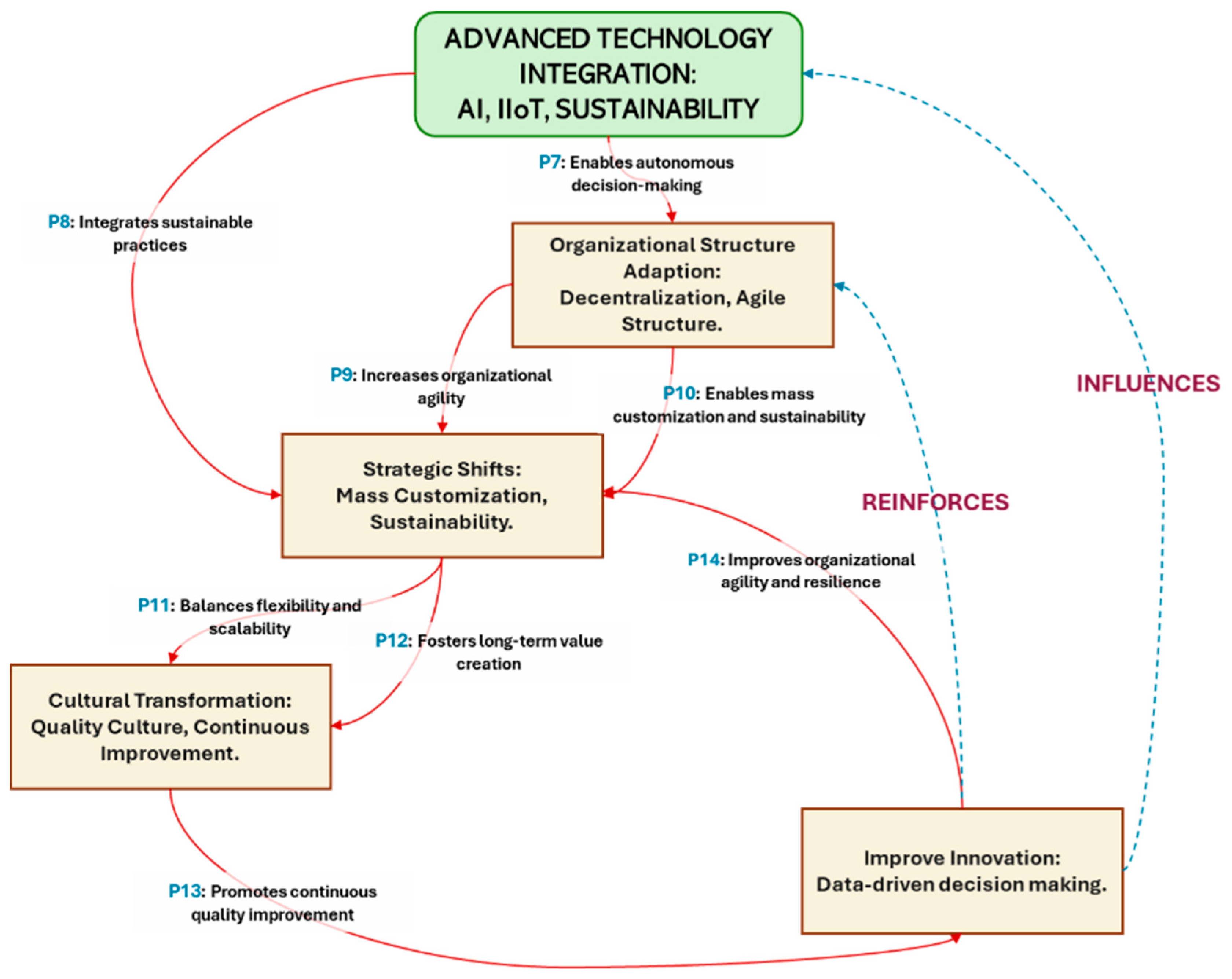 - C1. Advanced Technology Integration ➔ C2. Decentralized Organizational Structures. Advanced Technological Integration (C1) functions as a catalyst for the transformation of organizational structures. The implementation of technologies such as AI and the Industrial Internet of Things (IIoT) enables autonomous systems and data-driven decision-making in real time. This capability necessitates and encourages the development of decentralized organizational structures (C2), as evidenced by propositions P3, P7, and P9. The implementation of advanced technologies enables operational departments to make autonomous decisions, thereby reducing the necessity for centralized control and increasing organizational agility.