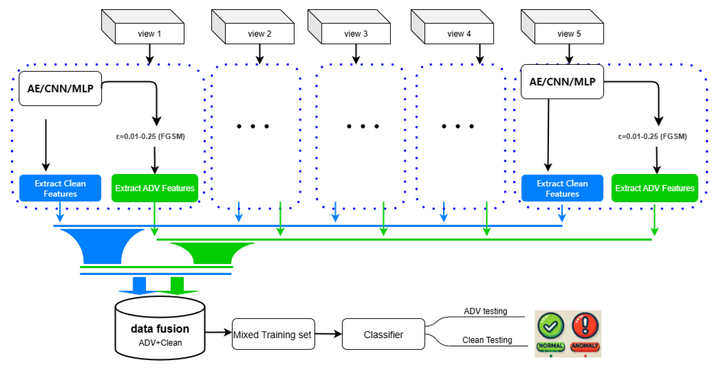 - Multi-Level Validation of the Robustness of Multi-View DL Models: While prior studies have predominantly concentrated on enhancing the adversarial robustness of single-view models, this work introduces a novel multi-view fusion strategy to validate the robustness advantages of multi-view architectures in adversarial settings. Experimental findings reveal that by aggregating complementary information from feature spaces, multi-view models demonstrate a marked ability to withstand targeted attacks that compromise single-view models. This integration not only bolsters the resistance of intrusion detection systems to adversarial threats but also enhances their stability and generalization performance across diverse threat scenarios.