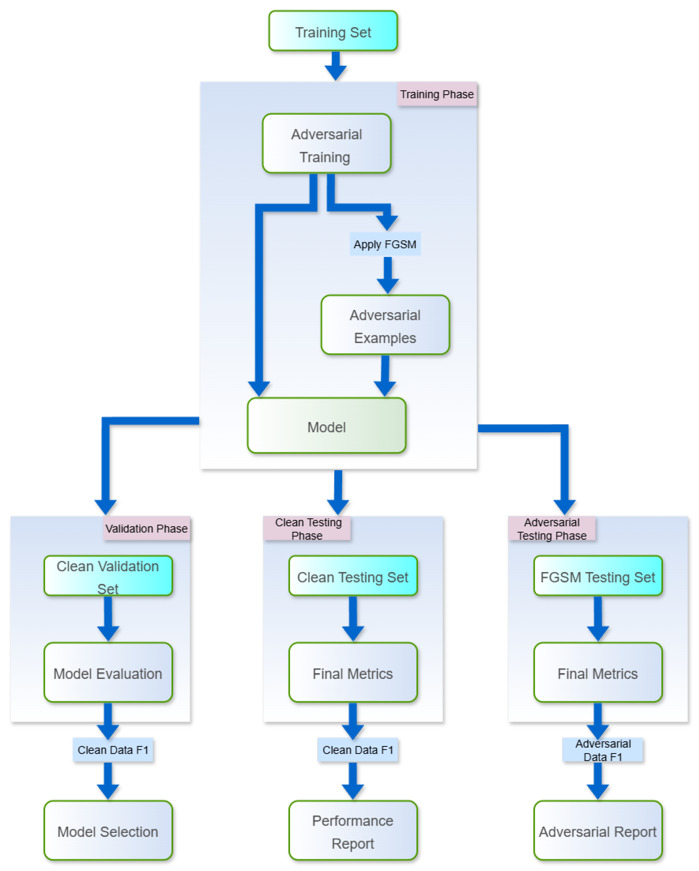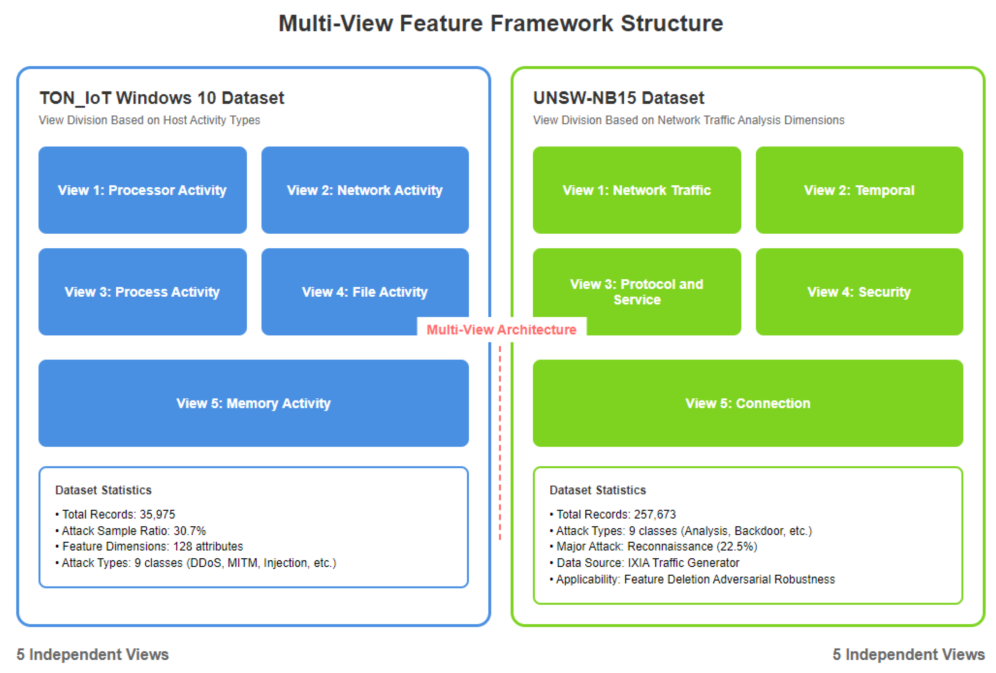 - Dual Test for Performance and Robustness: In the testing phase, this study adopts a dual verification mechanism that assesses model performance on both clean and adversarial test sets. By analyzing both performance retention and adversarial robustness, the stability of multi-view models across different evaluation environments is thoroughly examined. This approach effectively overcomes the limitations of conventional evaluation methods that overlook adversarial scenarios, thereby offering a rigorous and systematic methodology for the validation of reliable intrusion detection systems.