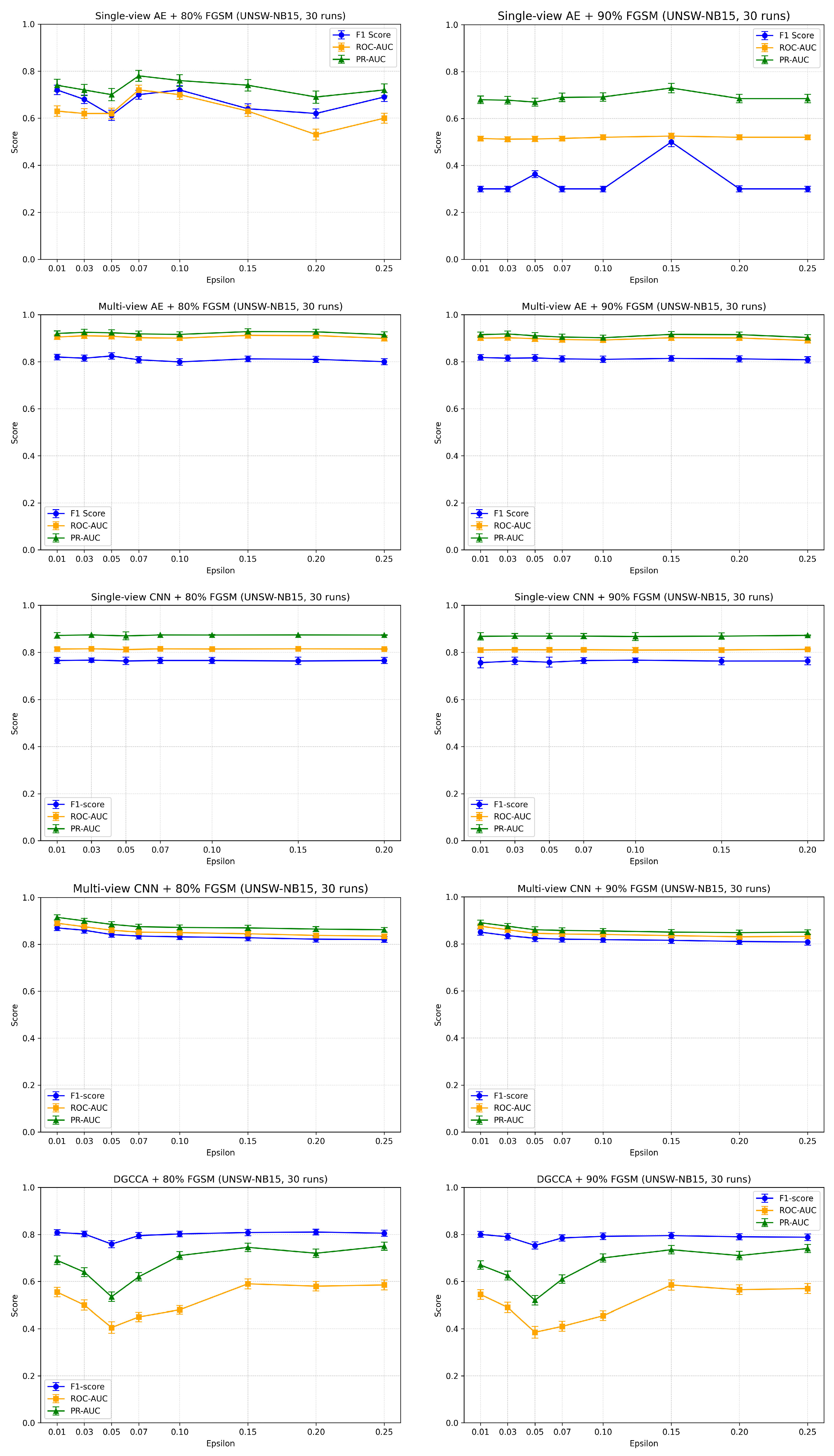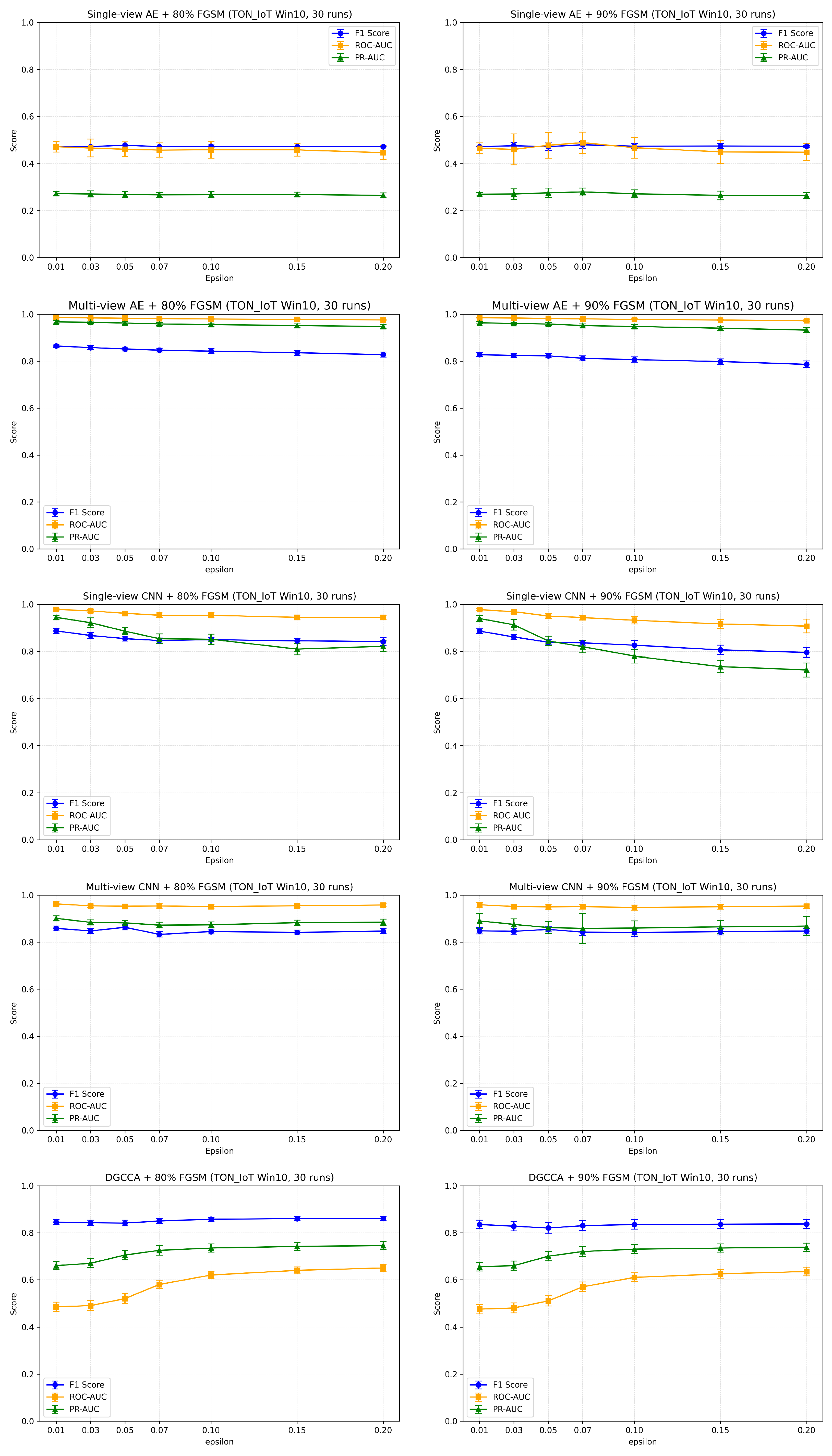 - Under varying perturbation intensities, the F1 score of the multi-view CNN decreases by less than 0.04 within the range , maintaining a relatively stable trend. The multi-view AE similarly exhibits limited performance fluctuation, with a ΔF1 not exceeding 0.03. While the single-view CNN shows a downward trend, it still performs better than DGCCA. In contrast, the PR-AUC and ROC-AUC curves of the single-view AE and DGCCA fluctuate significantly under medium to high perturbation levels. Overall, the multi-view models exhibit more stable performance across different perturbation intensities, with smoother metric curves and slower degradation, indicating stronger resistance to adversarial perturbations.