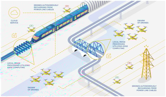 UAVs, often referred to as drones, have transitioned from being tactical military tools to essential resources in a variety of civilian fields, such as infrastructure surveillance, precision farming, and emergency response [1,2,3]. Their capability to operate in dangerous or isolated locations makes them especially valuable for assessing critical infrastructure more effectively than conventional techniques [4,5]. The advent of swarm-based UAV systems represents a notable progress in drone technology [6]. These systems facilitate scalable, fault-tolerant, and cooperative multi-agent operations, providing improved coverage, adaptability, and efficiency for dynamic missions such as inspecting power lines, pipelines, precision agriculture, and bridges [7,8,9]. As shown in Figure 1, swarms of intelligent, collaborative drones are increasingly utilized in industrial and emergencies situations, where they can sustain real-time communication and data transfer even in regions without ground-based infrastructure [10,11].