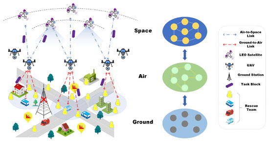 Drone security is becoming an increasingly vital aspect of drone operations. Many drones were developed without considering security features, functioning in open connections and variable environments [20,21]. Consequently, safeguarding privacy and security is crucial in UAV-assisted networks, as these UAVs are susceptible to attacks and can be easily compromised by intruders [22]. Figure 2 shows a UAV-assisted communication system across space, air, and ground layers. Designed for emergency coordination, it highlights vulnerabilities in data links that are exposed to interception or disruption. The use of low Earth orbit (LEO) satellites, UAVs, and ground stations underscores the need for strong security protocols [23]. These structural features also apply to the broader Internet of Drones (IoD), which faces similar challenges due to the lack of standardized security frameworks [22].
