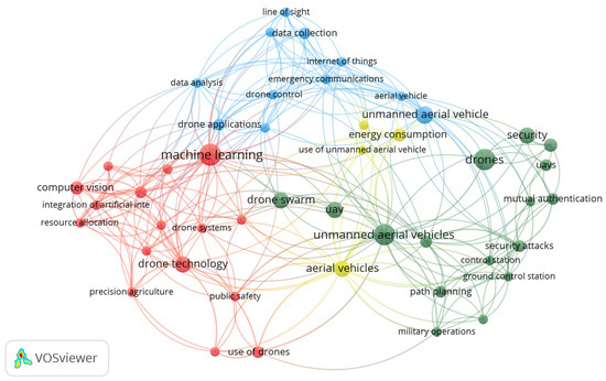 To assess evolving research trends in drone security, a bibliometric analysis was performed using Scopus-indexed journal articles. The search included the keywords ‘drone’, ‘security’, ‘communication’, and ‘integrity’, yielding 578 documents. Keyword co-occurrence mapping was performed using VOSviewer 1.6.20.0, with the resulting visualization shown in Figure 3.