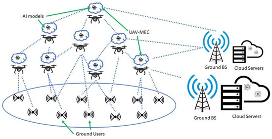 The incorporation of artificial intelligence (AI) and machine learning (ML) is further advancing drone functionalities [1,98]. Drones equipped with AI can independently traverse intricate environments, identify irregularities, and process extensive data in real time [99,100]. This evolution is exemplified in Figure 4, which illustrates a UAV mobile edge computing (MEC) network architecture where AI-enabled drones interact with ground users, collaborate with one another, and offload data to edge and cloud infrastructures. Such architectures highlight the growing role of distributed intelligence and real-time analytics in aerial networks [101].