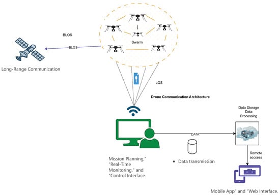 Communication strategies within drone swarms can be divided into autonomous and managed systems. Autonomous systems depend on local interactions among drones, reducing the necessity for centralized communication [108]. This decentralized model is beneficial in expansive or fluid environments with restricted connectivity [78]. In contrast, managed systems rely on a central unit where a leading drone directs commands to the swarm [109]. Although effective for orchestrated actions, this approach is susceptible to delays and interruptions, especially in large-scale operations [18]. Architectures of drone swarm networks are categorized into infrastructure-supported and FANET frameworks [110]. Figure 5 illustrates a hybrid architecture where clustered UAVs communicate via Bluetooth and relay data to a ground station using WiFi, exemplifying both infrastructure-supported and FANET characteristics [46].