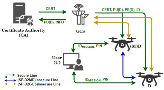 The protocol demonstrates the flow of credentials and keys among the CA, GCS, user, master drone, and other drones. Green arrows indicate secure communication channels, while blue and yellow arrows represent insecure links. Key elements include certificate issuance (CERT), public/private keys (PU(D), PR(D)), and mission credentials (IDMISSION, PIN) [90].