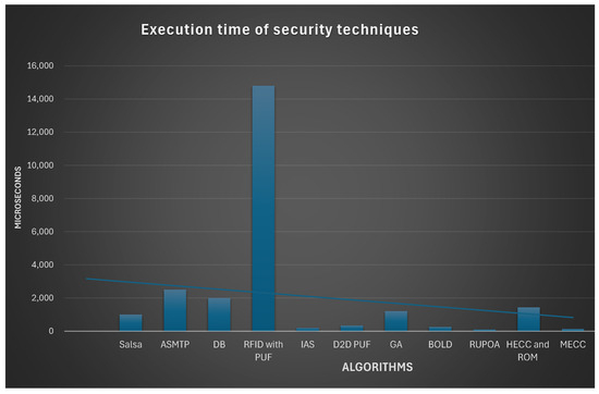 As part of the assessment of communication protocols for UAV networks, execution time acts as a crucial performance metric, especially in latency-sensitive environments where quick reactions are vital [121]. In swarm-based UAV systems, where real-time coordination and data sharing are essential, the computational efficiency of security and communication algorithms greatly affects operational effectiveness [45]. Recent comparative analyses have examined the execution times of various algorithms utilized in UAV networks. Among these, the radio-frequency identification (RFID) with PUF method displayed the highest latency, with execution times nearing 16,000 microseconds [122]. While this technique provides strong security through hardware-based authentication, its considerable computational demands raise concerns regarding its practicality in resource-limited or time-sensitive situations [74]. To provide additional context, these execution times were derived from benchmark studies using embedded platforms such as Raspberry Pi 4 (1.5 GHz CPU, 4 GB RAM) and simulated environments (MATLAB 2018a Simulink and NS-3) for protocols like ASMTP, RFID + PUF, and blockchain-based schemes. The reported values represent average execution times under standard cryptographic libraries and default parameter settings as documented in [122,123,124]. This clarification ensures transparency regarding the experimental conditions and supports the validity of the performance metrics presented. In contrast to the high-latency RFID with PUF, algorithms such as Salsa, ASMTP, and derived blockchain (DB) showed significantly reduced execution times [33,48]. Their lightweight characteristics and quick processing make them ideal for embedded systems and internet of things (IoT) driven UAV applications, where energy efficiency and real-time reactivity are crucial [102]. These algorithms manage to achieve a favorable balance between security and performance, making them suitable for swarm coordination and dynamic data interchange. Other methods, including identity and aggregate signature (IAS), drone-to-drone (D2D) PUF, grouped authentication (GA), bio-inspired optimized leader election (BOLD), RUPOA, hyperelliptic curve cryptography (HECC) and random oracle model (ROM), and MECC, fall into a moderate execution time range [35,38,87,123,124,125,126]. These approaches may serve as effective alternatives for general UAV applications, providing a compromise between computational efficiency and cryptographic strength. For example, RUPOA incorporates routing optimization, while D2D PUF combines device-level authentication with moderate latency. As illustrated in Figure 8, the comparative execution times highlight the necessity of choosing algorithms not solely based on their security capabilities but also on their computational efficiency. In UAV swarm networks, where timing, energy, and processing limitations are crucial, this dual focus ensures that communication protocols are both secure and operationally feasible [10]. These insights guide protocol selection in UAV swarm design, where the need for mission-critical responsiveness must be balanced with secure communication.