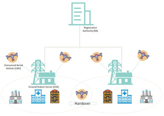The architecture illustrates interactions among the RA, GSS, and UAVs, highlighting registration, authentication, and secure handover during mobility [26].