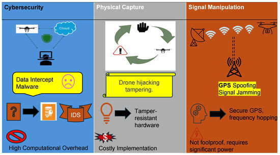 UAVs are becoming more susceptible to a variety of cyber threats due to their dependence on unsecured or poorly encrypted communication channels [142]. These vulnerabilities expose them to risks such as eavesdropping, packet manipulation, and malware injection through compromised control pathways, potentially corrupting mission data or hijacking drone operations [29,140,143]. Such threats are especially severe in reconnaissance and delivery missions, where data confidentiality and integrity are crucial [43,90]. As depicted in Figure 10, these threats range from data interception to physical interference, posing substantial risks to operational integrity and safety [144].