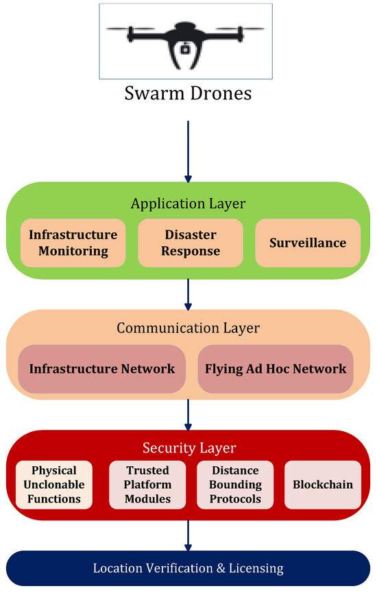 The swift advancement of drone technology has considerably broadened the range of UAVs, especially swarm drones, across numerous mission-critical and commercial uses [54,55,56]. Swarm drones are increasingly utilized in situations such as search and rescue operations, autonomous deliveries, precision farming, and environmental observation [57,58,59]. UAVs are now embedded in a wide spectrum of applications—including security and surveillance, mapping and farming, filming and inspection, and logistical tasks such as delivery and crop spraying—highlighting their versatility and growing significance across industries [60]. These applications take advantage of swarm intelligence, allowing for distributed decision-making, adaptive control, and collaborative task execution [61,62]. Nevertheless, their use in regulated settings requires strict assurances regarding device authenticity, data origin, and spatial integrity [3].
