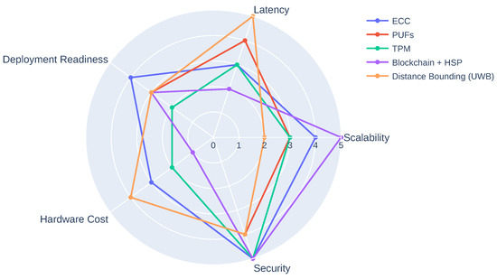 Notably, the co-occurrence of “data analysis” with “mutual authentication”—and the relative underrepresentation of “use of drones”—indicates that modern research emphasizes data-centric integrity techniques over basic drone operations. Blockchain-based solutions continue to gain traction due to their tamper-resistance and decentralized ledger characteristics [47]. For instance, the Anonymous Secure Messaging Token Protocol (ASMTP) [48] introduces token-based authentication mechanisms and integrity-preserving communication within UAV swarms, combining formal verification with lightweight encryption. In summary, the literature reflects an increasing convergence between machine learning, energy-efficient cryptographic techniques, and protocol-based authentication, with emerging attention to scalable trust frameworks such as blockchain and PUF-based identity verification [49,50]. In contrast, this review emphasizes hardware-assisted security, which provides stronger guarantees through physical tamper resistance and device-level uniqueness [17]. While a few recent studies have touched on PUFs or TPMs in UAVs, they often do so in isolation or without a comparative framework [16,51,52,53].