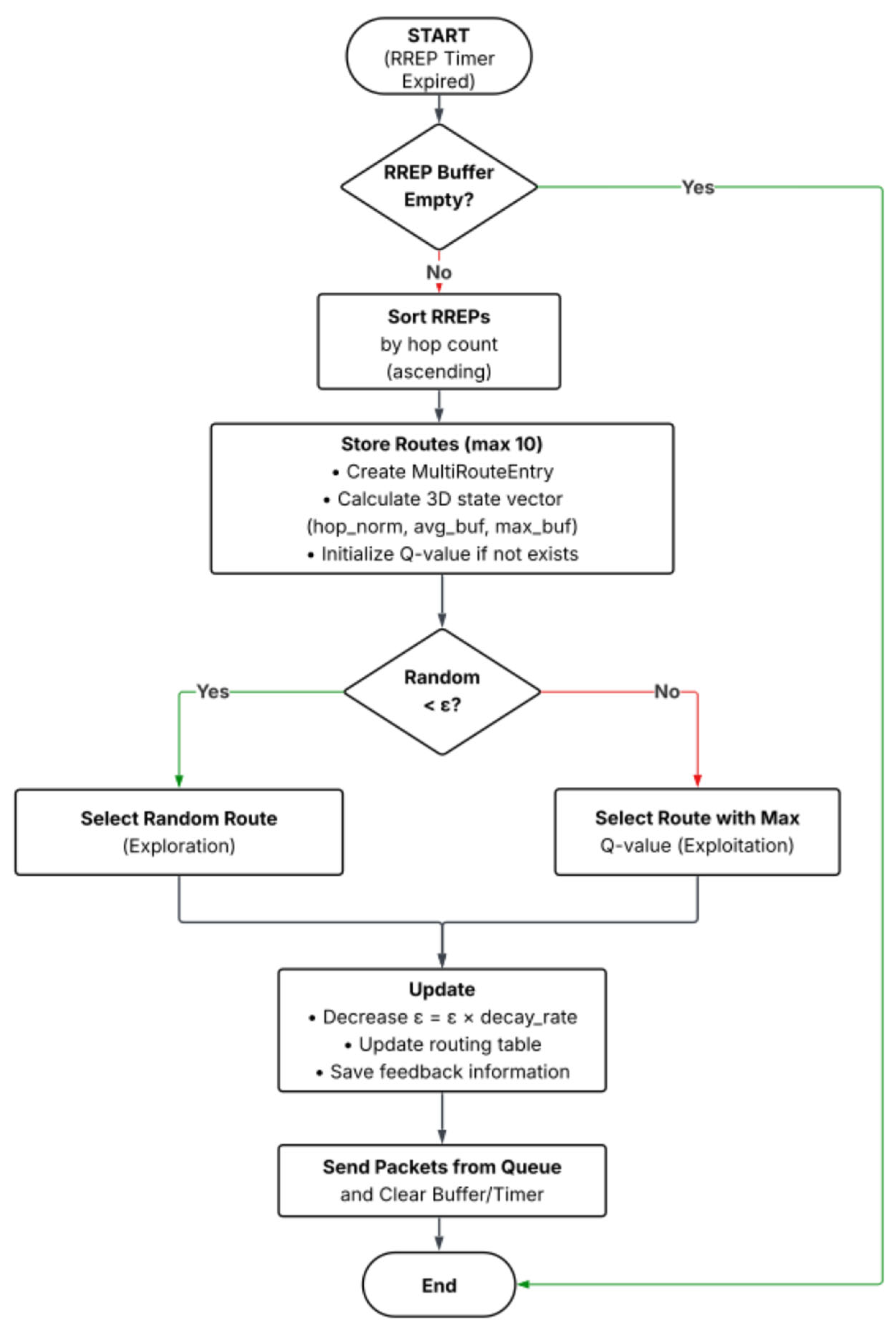 In the Q-learning model, the source node maintains a Q-table (m_qTable) that maps state-action pairs to Q-values, which are the expected gain (reward) of going along a specific path under a given network state. If a just-calculated (state, action) pair is not found in the Q-table, it is initialized as a default Q-value, generally to zero or a tiny random number. This initialization enables the learning algorithm to begin assigning rewards for the success or failure of subsequent packet transfers. The second is selecting a route (action) from the candidate set based on an ε-greedy policy, exploring and exploiting. With probability ε (initially 0.5), the algorithm selects a random routeId from available candidates in m_multiRoutes[D], stimulating exploration of diverse paths.