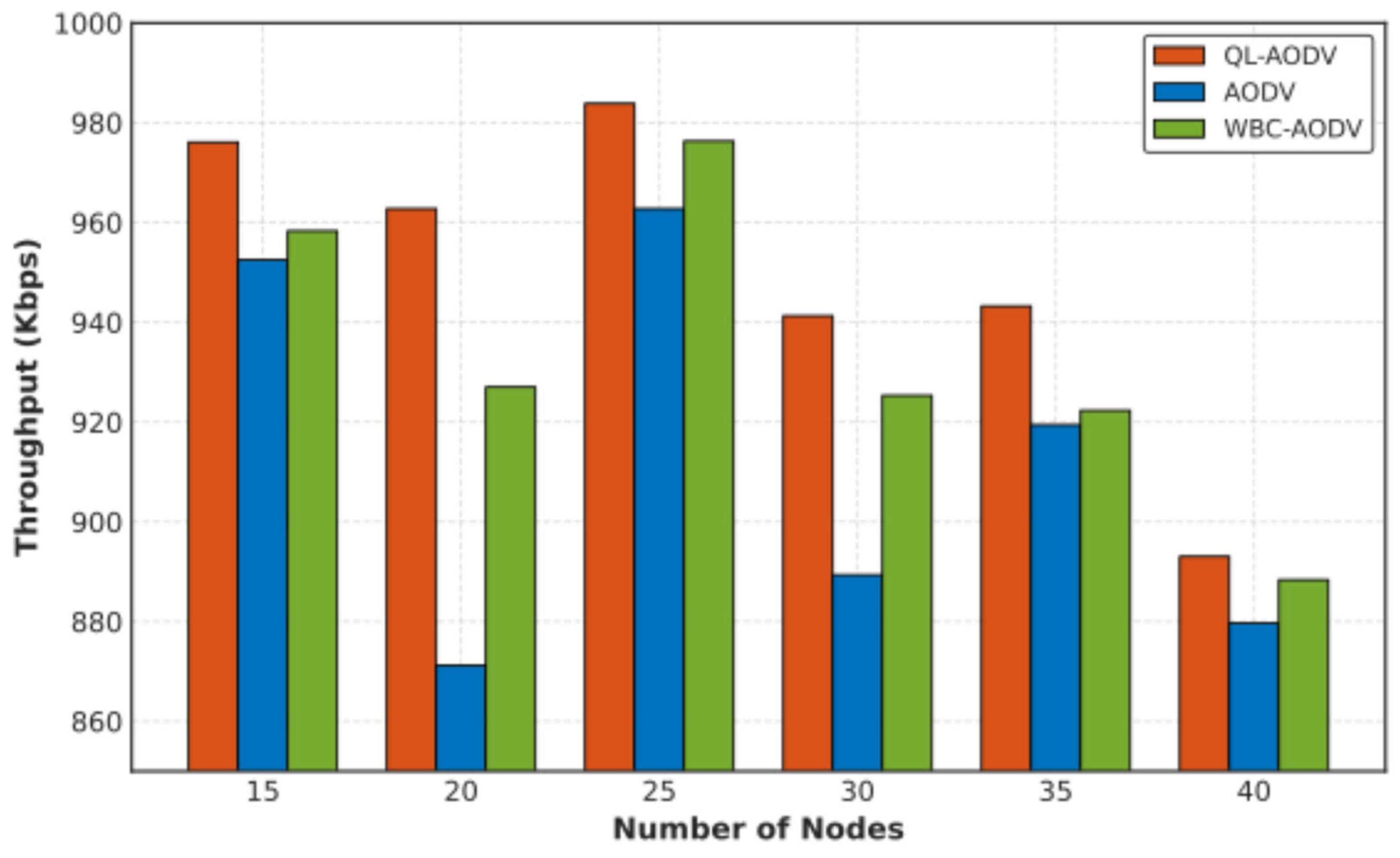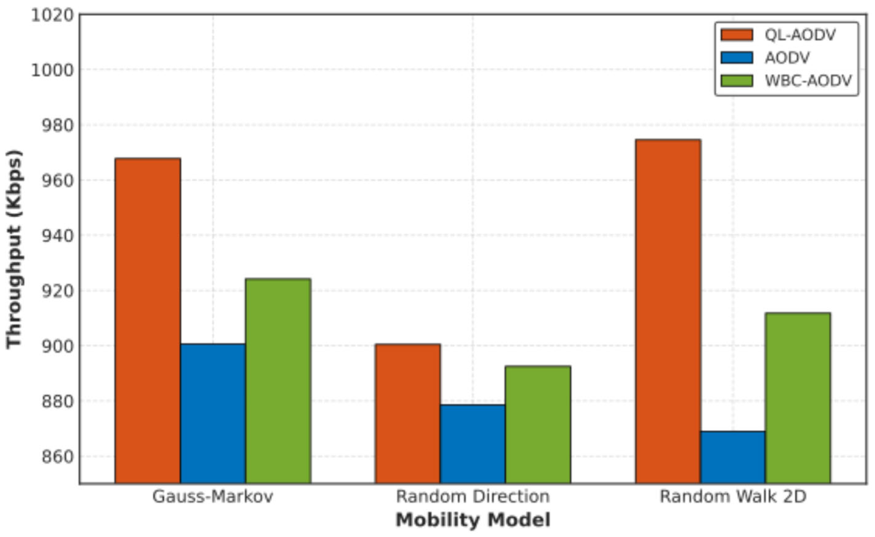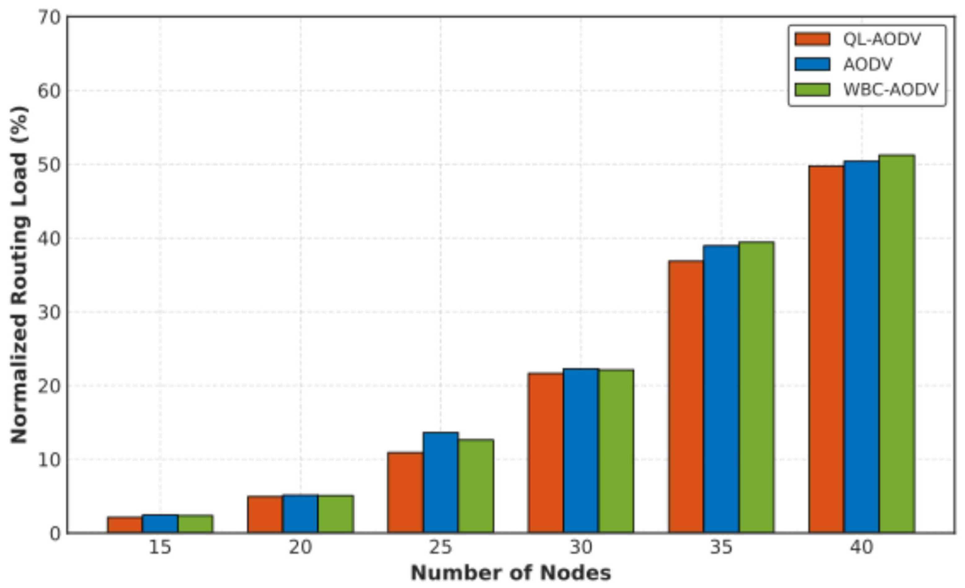 Our QL-AODV implementation monitors the AODV routing buffer (RequestQueue) rather than the MAC layer transmission buffer. The AODV routing buffer stores packets awaiting route discovery at the network layer, while the MAC buffer stores packets with established routes awaiting channel access. We focus on AODV buffer occupancy because: (1) it directly reflects routing protocol performance issues, (2) its congestion triggers costly route rediscovery processes in high-mobility UAV networks, and (3) it provides actionable information for routing optimization decisions. The buffer occupancy fields in our extended RREP format (m_totalBuffer and m_maxBuffer) specifically measure the percentage occupancy of AODV routing queues, enabling intelligent congestion-aware route selection.