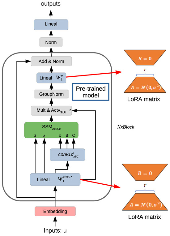 where and , and r is the rank of the low-rank decomposition with . This decomposition introduces only a small number of trainable parameters compared to the Mamba model’s total parameter count, resulting in a lightweight adaptation mechanism that preserves its computational efficiency. The modified input projection, referred to as the LoRA-adjusted input transformation, is formally defined in Equation (2):